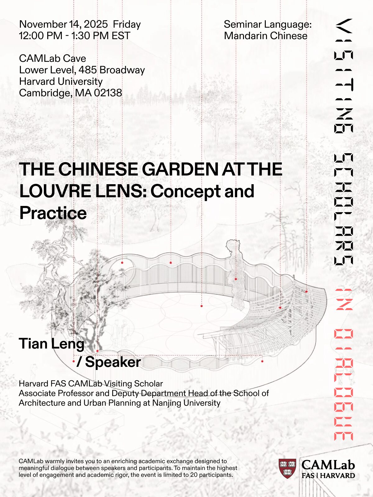 Tian LENG is the Associate Professor, Deputy Department Head, and Master’s supervisor of the School of Architecture and Urban Planning at Nanjing University. He is also the visiting Scholar at Harvard FAS CAMLab for the academic year 2025-2026. His main research areas include the protection and renewal of modern architectural heritage, and the comparison of Chinese and Western cultures.